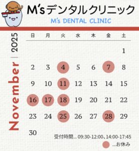 11月の休診日のお知らせ 2025.11.01 ご予約方法は2種類! 電話予約 受付時間/9:30 – 12:00、14:00-17:45 【098-893-8049】までご連絡ください。 ※尚、診察中はお電話に出ることができません。ご了承ください。 ネット予約 受付時間/24時間対応 空き状況も確認できます。 ネットでのご予約はこちらから☟ 予約ページ 今月も皆さんと一緒に歯の健康を支えていきます。 よろしくお願いします。 Tweet Share Hatena Pocket RSS feedly Pin it 10月の休診日 前の記事 12月の休診日 次の記事